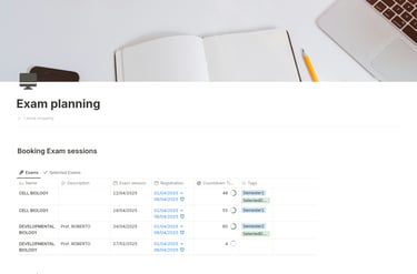 The Exam Booking & Study Planner is a Notion template designed to help students effectively organize their exam schedules, track registration deadlines, and plan their study sessions efficiently.