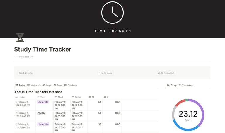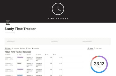 Study Time Tracker – The Ultimate Productivity Tool for Students Stay organized and enhance your study habits with the Study Time Tracker, a comprehensive Notion template designed to help students maximize their focus and efficiency. Whether you're preparing for exams, working on assignments, or simply tracking your daily learning hours, this template is your go-to solution.